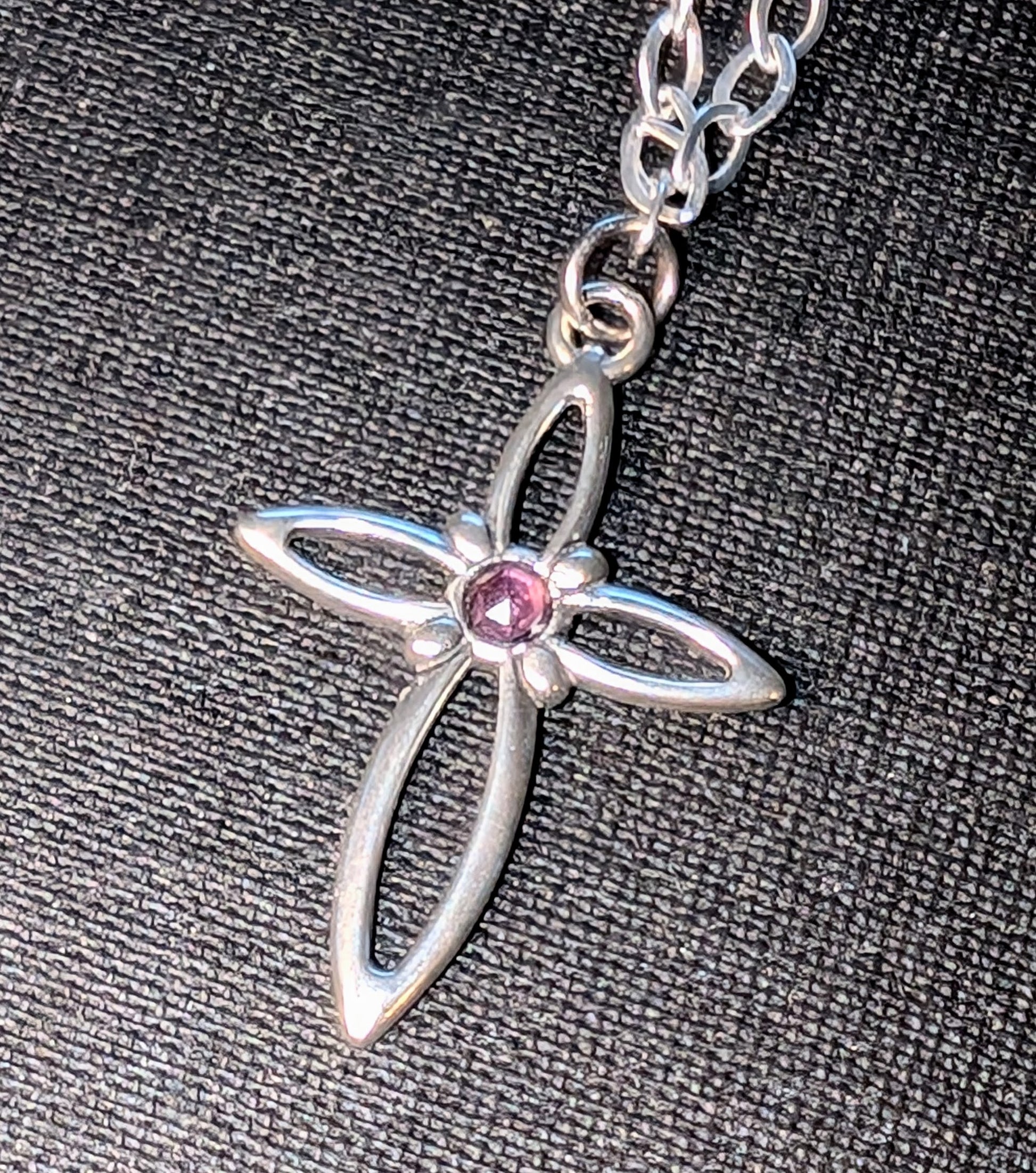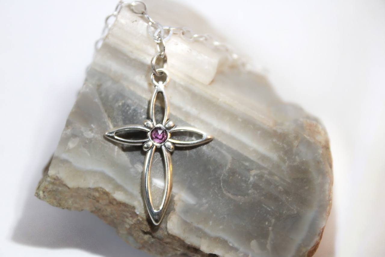 Silver Box Chain necklace with an Open Cross Pendent with 3mm gemstone inset in center.
